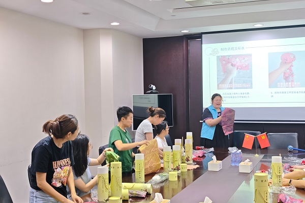 隨后,在老師手把手的指導(dǎo)下,職工們興致盎然地動手實踐,親手將艾草等天然材料填充、捆扎成型,制作出一個個兼具實用與美觀的艾草養(yǎng)生錘。